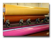 Also, we have the ability to rewind / slit numerous rolls of narrow width material with dry adhesive on liner paper from wide web jumbo rolls of the same. Tension control features of the machines cause the individual rolls to have uniform cuts, despite the wide width of the jumbo rolls being cut. So, the rewind/slitting process essentially creates numerous smaller rolls from one larger roll of material.